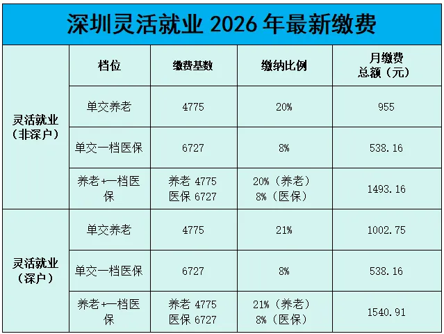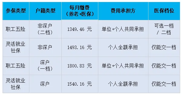 灵活就业对比职工五险来说,保障方面就没有职工五险那么全面,依旧区分深户/非深户、但是医保只能交一档,且只有三种缴费组合,先来看看灵活就业的缴费明细,如下图: