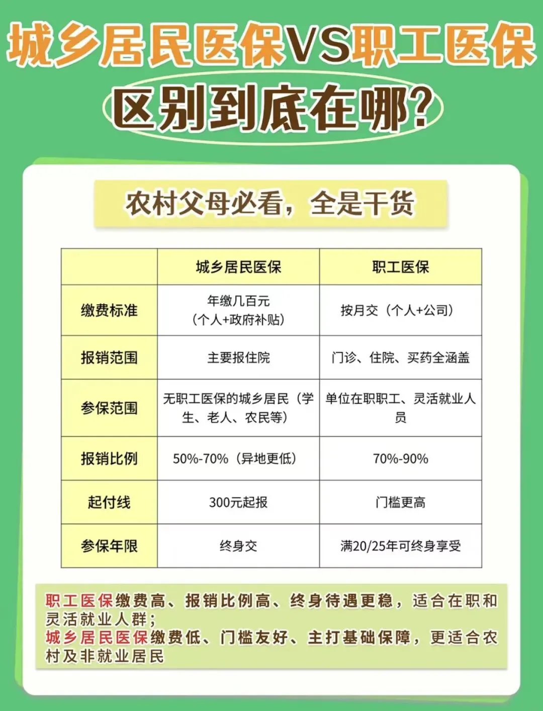 事实上我们人的本性就是这样,往往我们在健康的时候,根本不觉得有没有医保是个重要的事情,很多人都觉得无所谓很忽略,但事实最后都是自己害了自己现实痛点:很多人就是为了多那么几百块养老金,却忽略了医保才是保命钱,通常 “小病靠撑、大病等死”。包括突然发生的意外,意外的来临是谁都不知道的,是未知的。有一句话叫永远不知道意外和明天哪个先来很多人把医保当做可交可不交的附加项,总感觉养老金才是社保的核心,可真正经历过生活,见过医院巨额账单的人都明白,医保才是社保核心,是现代人安身立业,提升生存质量的底线,是抵御大病及意外风险的唯一可靠防线但也有很多人是重视医保的,但是呢,他们买的居民医保,那居民医保好不好呢,来对比一下