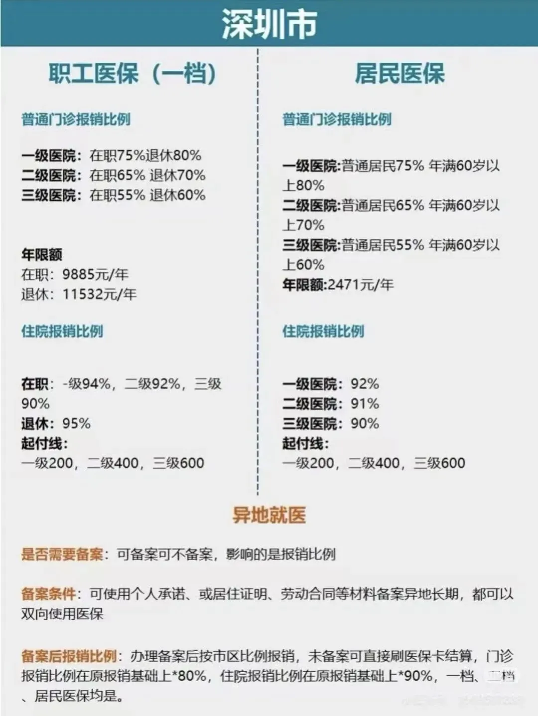 居民医保的核心优势是缴费成本低,参保门槛较低,是短期低成本过渡保障的选择,有几点弊端:终身缴费,额度有限,只适合无稳定收入来源的人群,而职工医保就是长期高保障的最优选择,尤其适合退休后享受终身福利但是为什么要选择职工医保呢,深圳职工医保的报销待遇,在全国属于第一梯队,比长沙、很多城市都强太多。深圳真实保险案例,报销比例都是是非常高的,这就是为什么都觉得深圳医保好我们把职工一档、二档、居民医保的门诊、住院、大病、个人账户全拆开讲清楚,你一眼就能看出为什么优先选职工医保,先来看看深圳职工医保的报销政策吧