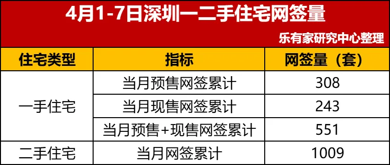 【深圳】4月1-7日一手住宅预售网签累计308套,现售网签累计243套,预售+现售网签累计551套;本月二手住宅累计网签1009套。