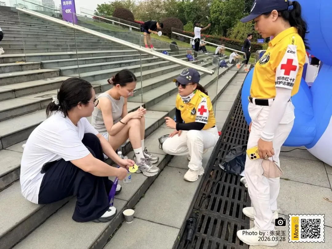 每当有跑者遇到困难——无论是不慎擦伤需要清创包扎、扭伤脚踝急需固定处理、肌肉痉挛亟待拉伸缓解,还是因体力消耗过大引发低血糖,面色苍白、头晕乏力地寻求帮助,队员都会第一时间上前,熟练开展伤情评估、肌肉放松、止血包扎、能力补给等应急处置,动作专业利落,语气温和耐心。