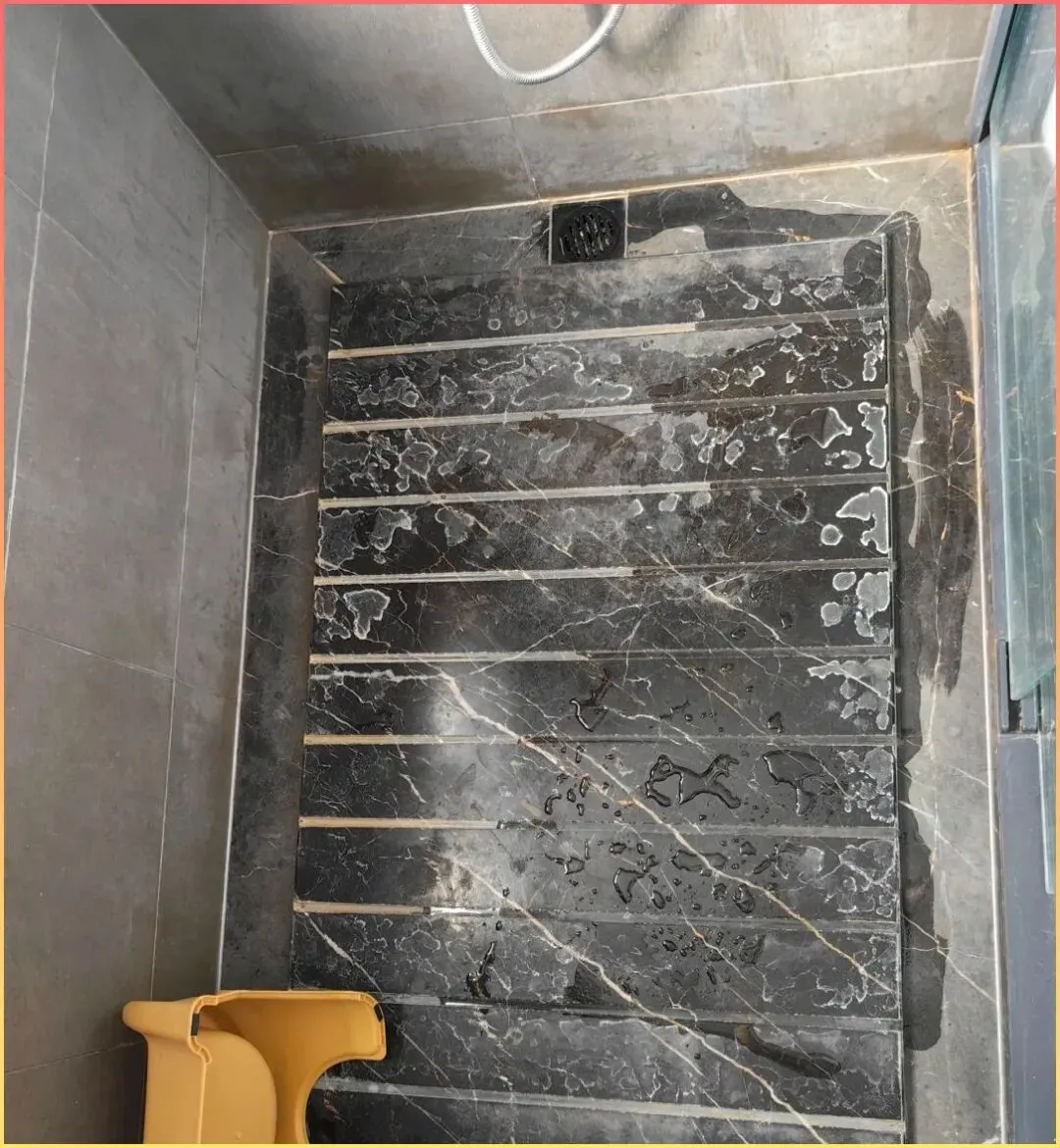 这.位业主家选了黑色的石材.拉槽,.结果现在变成了卫生间最恶心的地方。