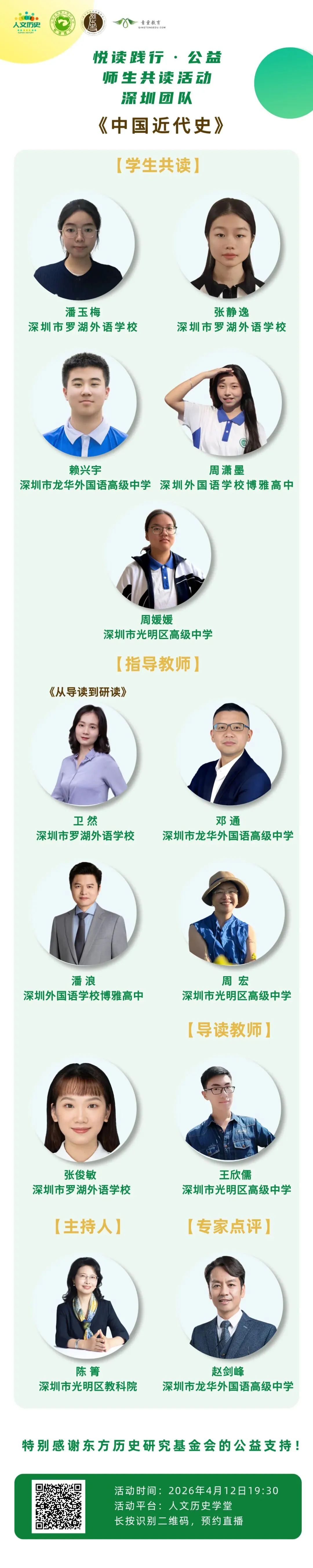 当厚重的《中国近代史》遇上鲜活的青春视角,当一线名师与少年学子双向共鸣,一场关于历史、关于成长、关于思考的公益共读盛宴即将开启!“悦读践行・公益师生共读活动” 深圳团队《中国近代史》专场,重磅定档2026 年 4 月 12 日 19:30!本次活动由东方历史研究基金会公益支持,人文历史学堂全程直播,汇聚深圳名校师生、资深导读专家与专业点评嘉宾,以书为桥,解锁中国近代史的深层密码,让历史不再是冰冷的文字,而是可感、可思、可悟的精神盛宴。🌟 学生共读
