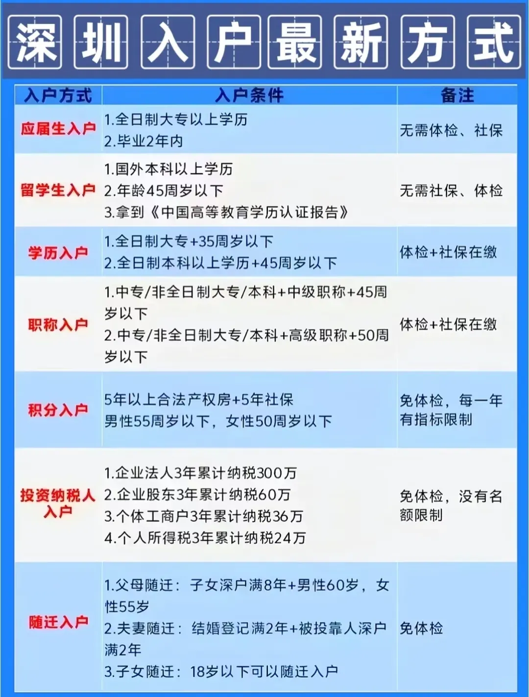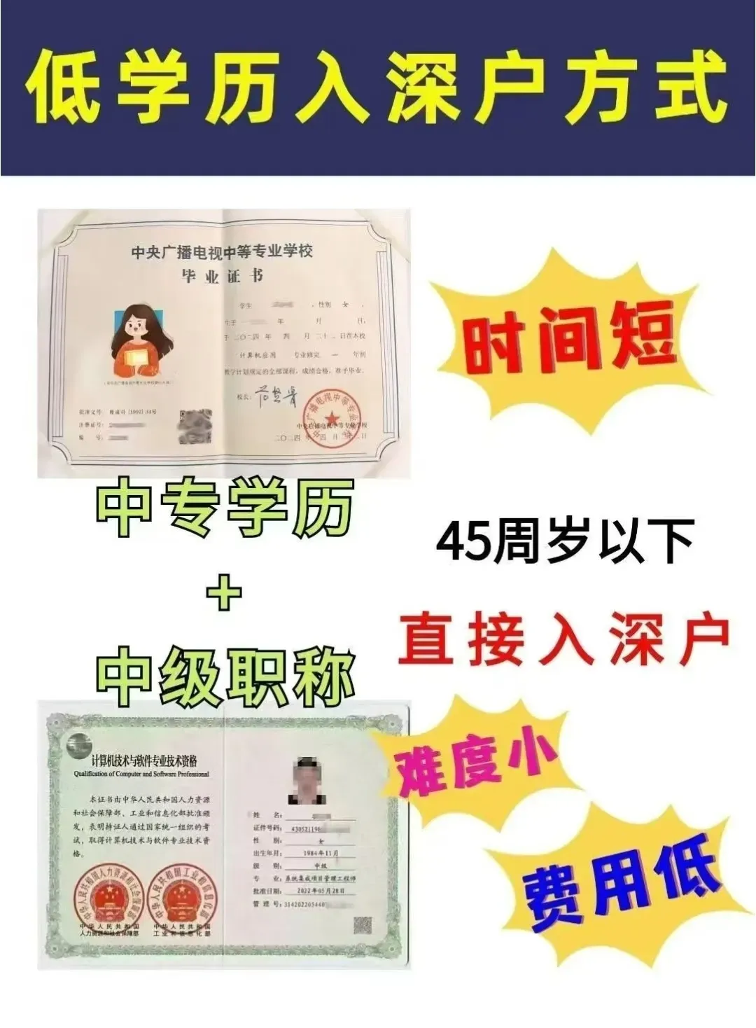 45岁以下,中专以上学历+中级职称+1个月以上社保,就可以核准入户深圳。