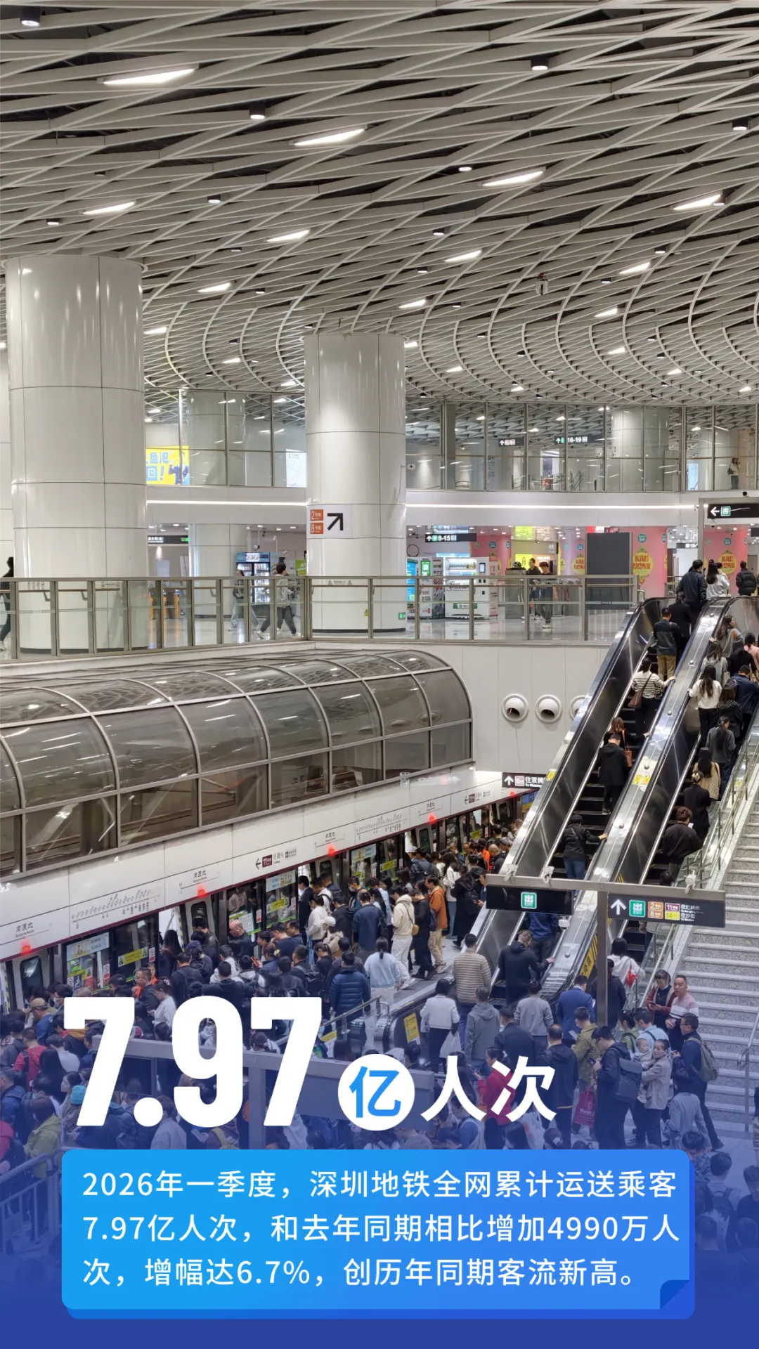 受新开通线路客流辐射带动影响,2026年一季度,深圳地铁全网累计运送乘客7.97亿人次,日均客运量达885万人次,同比增长6.7%,折射出经济社会的强劲活力。其中,深铁集团所辖线路运送乘客7.13亿人次,占全网客运量89.5%。