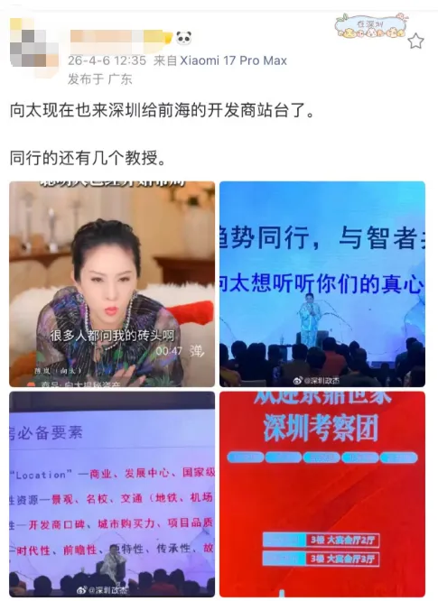 比如有微博大V爆料,“向太现在也来深圳给前海的开发商站台了,同行的还有几个教授。”