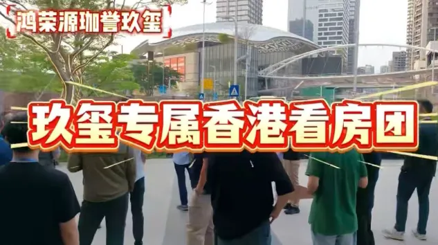 并且视频中有文字显示,大湾区投资客汇聚,玖玺专属香港看房团,视频里能看到黑压压的一群人。