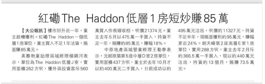 有媒体报道,红磡The Haddon,低层1房单位业主入手不足1年,短炒净赚85万港元,赚幅18%!