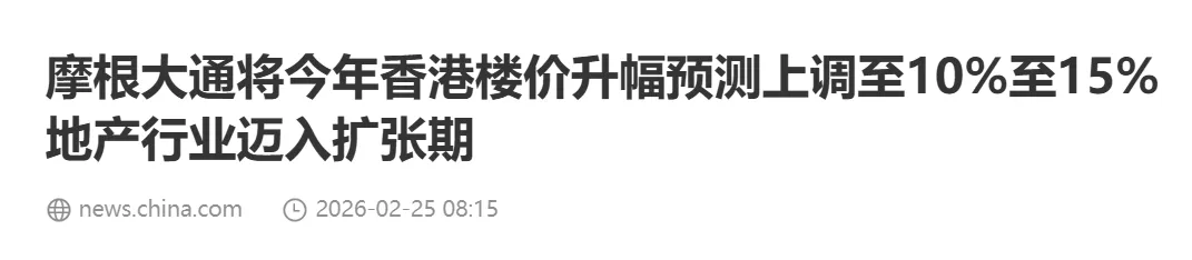 摩根大通紧随其后,将2026年香港楼价升幅预测从原先的5%至7%,上调至10%至15%。