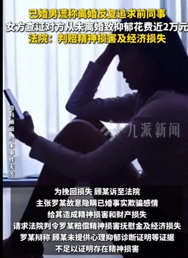 后续顾某通过自行查证得知,罗某自始至终处于已婚状态,从未办理过离婚手续。这一事实让顾某遭受了严重的精神打击,进而出现抑郁症状,为缓解心理创伤接受心理咨询治疗,顾某共计支付了近 2 万元的心理咨询费用。为挽回自身损失,顾某向法院提起诉讼,主张罗某故意隐瞒已婚事实欺骗感情,造成其精神损害与财产损失,请求法院判令罗某承担相应赔偿责任。
