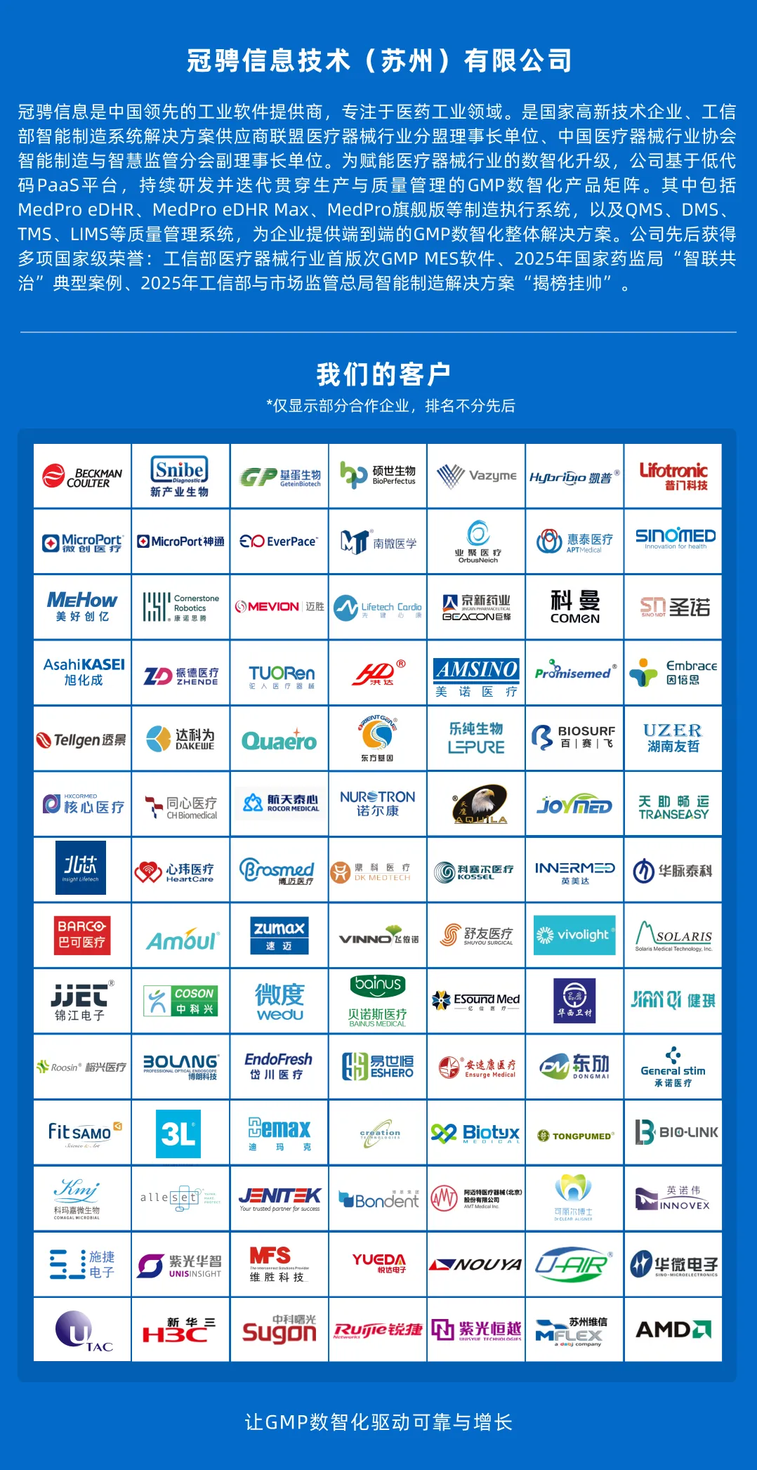 在医疗器械行业监管趋严、创新驱动高质量发展的当下,数智化转型已成为企业构建核心竞争力的关键路径。近日,深圳英美达医疗技术有限公司(以下简称“英美达医疗”)与冠骋信息技术(苏州)有限公司(以下简称“冠骋信息”)正式达成合作,部署MedPro eDHR,推进GMP数智化转型,旨在构建高效、透明、全流程合规的数智化生产质量管理体系,为企业持续的产品创新与发展夯实合规基石。英美达医疗部署MedPro eDHR,是基于国内外新版GMP施行的行业趋势、企业精密器械生产的高标准管理要求,以及全球化发展的战略选择,核心动因聚焦三大维度: