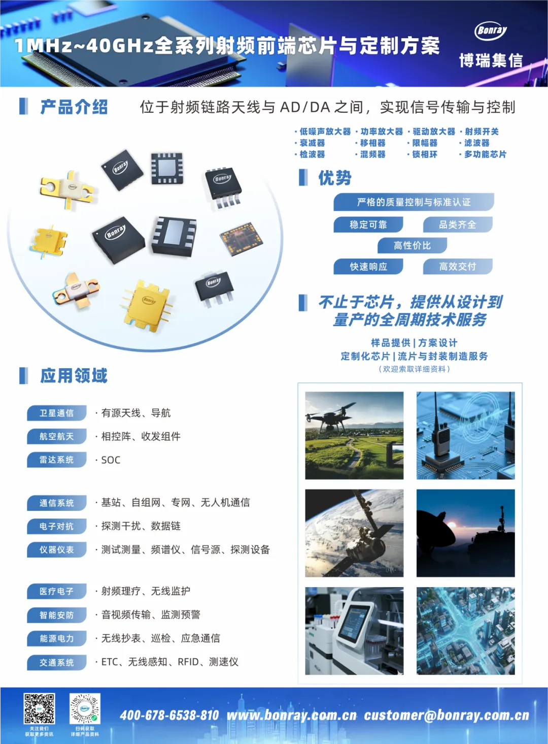 博瑞集信是一家国内领先的自主可控核心芯片和特种通信设备提供商。凭借经验丰富的团队、完备高效的平台、先进可靠的工艺,已在自主可控射频微波领域处于业界领先水平。公司专注于通信、雷达、航空电子等领域的核心芯片及关键模块的研发、生产与销售,通过提供完全自主可控的创新技术与完整的产品解决方案,能够灵活满足不同用户的个性化需求及快速创新需要。