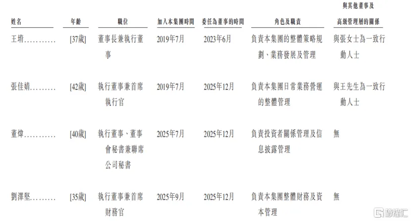 王堉现年37岁,担任董事长兼执行董事,拥有中山大学理论与应用力学学士及工程力学硕士学位。在创立远信储能之前,他曾就职于汕头航空、猛狮新能源等公司。张佳婧现年42岁,任执行董事兼首席执行官,持有哈尔滨工程大学英语学士学位和香港中文大学新媒体理学硕士学位,此前曾在杜邦太阳能、广发银行、申港证券、甬兴证券等机构工作。