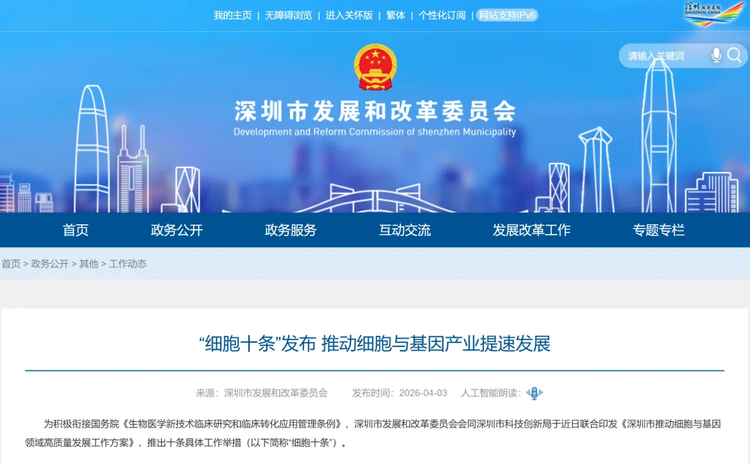2026年4月3日,深圳市发展和改革委员会与深圳市科技创新局引发《深圳市推动细胞与基因领域高质量发展工作方案》,推出十条具体工作举措(以下简称“细胞十条”),提出到2028年,深圳将实现三大核心发展目标: