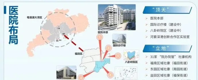 医院区位优越,环境优美,背靠南粤腹地、毗邻港澳地区,坐拥「城市绿肺」深圳中⼼公园和院内空中花园。不仅拥有院本部和 31 家社康中心(站),还着力建设河套深港科技创新合作区实验室、国际诊疗楼和八卦岭院区,打造医院发展新引擎。医院现有职工 2,700 余人,建筑面积达 21 万平方米,床位数 1,500 余张。