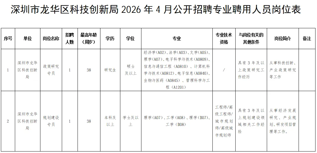 报考条件见《深圳市龙华区科技创新局2026年4月公开招聘专业聘用人员岗位表》(附件1),报考人员需符合招录岗位所要求的资格条件。岗位专业要求参考《广东省2026年考试录用公务员专业参考目录》(附件5)。