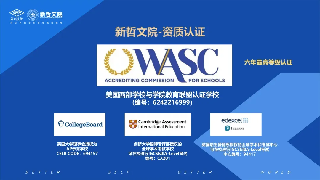 学校是美国西部院校联盟(WASC)六年最高等级认证学校(编号:6242216999),英国培生爱德思考试局授权的IGCSE和A-Level全球学术考试中心(中心编号:94417)、剑桥大学国际考评部授权的全球学术考试学校(编号:CX201)、美国大学理事会AP示范学校(CEEB CODE:694157)。