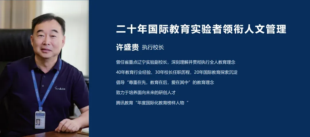 执行校长许盛贵拥有二十年国际教育经验,兼具省重点中学管理经验,将人文管理与全人教育理念贯彻于校区管理的方方面面。学校领导班子齐心协力,始终如一地践行以学生为本的教育理念,着重引导学生塑造个人价值观,推崇鼓励式教育,推动学校持续发展。