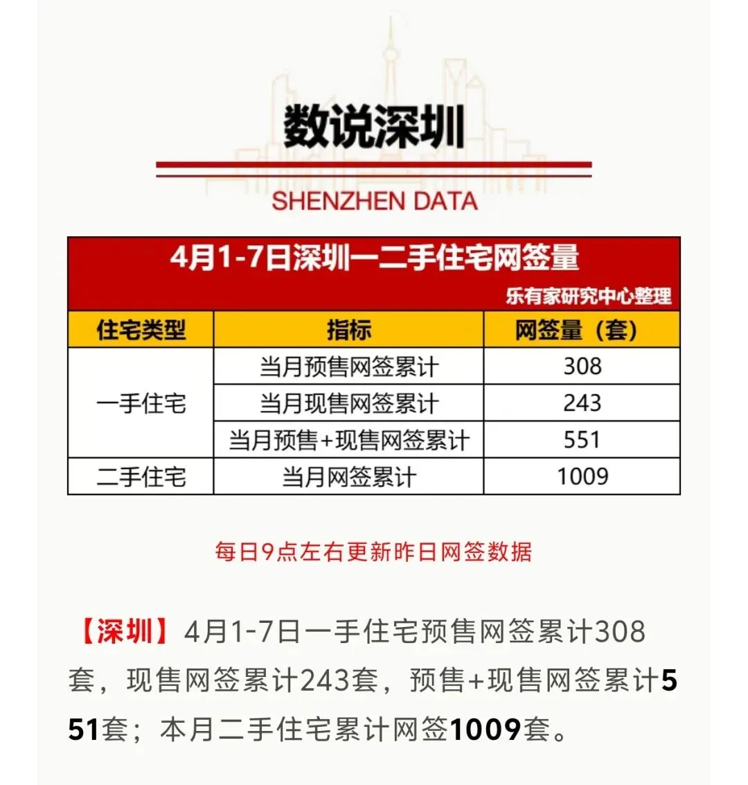 进入4月,深圳楼市交易节奏保持平稳,4月1-7日的网签数据给出了直观反馈。一手住宅方面,预售网签累计308套,现售网签累计243套,预售+现售合计网签551套,新房市场交易有序推进;二手住宅表现同样亮眼,本月累计网签已达1009套,延续了一季度的刚需主导态势,成为市场交易的核心支撑。
