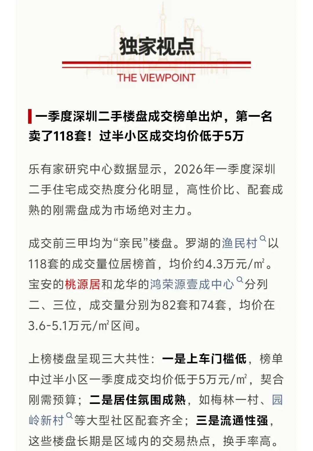 乐有家研究中心发布的2026年一季度深圳二手楼盘成交榜单,精准反映了当下市场的置业偏好:高性价比、配套成熟的刚需盘,成为购房者的首要选择。