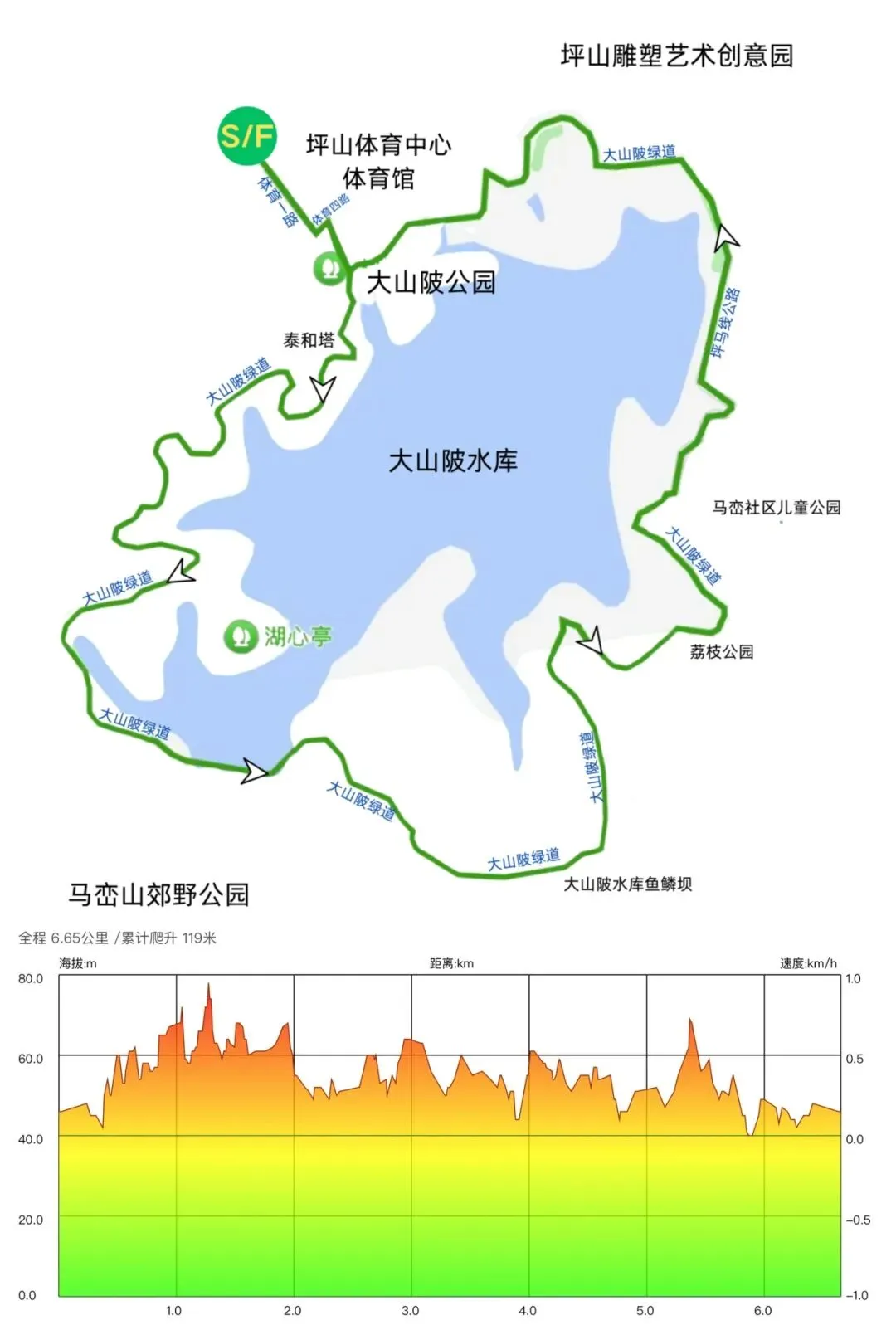 坪山体育中心体育馆(起点)→体育一路→坪山大山陂绿道→大山陂水库鱼鳞坝→坪山大山陂绿道→坪马线公路→坪山大山陂绿道→坪山体育中心体育馆(终点),6.6公里*5圈,全长约33公里(可根据自身情况量力而行);