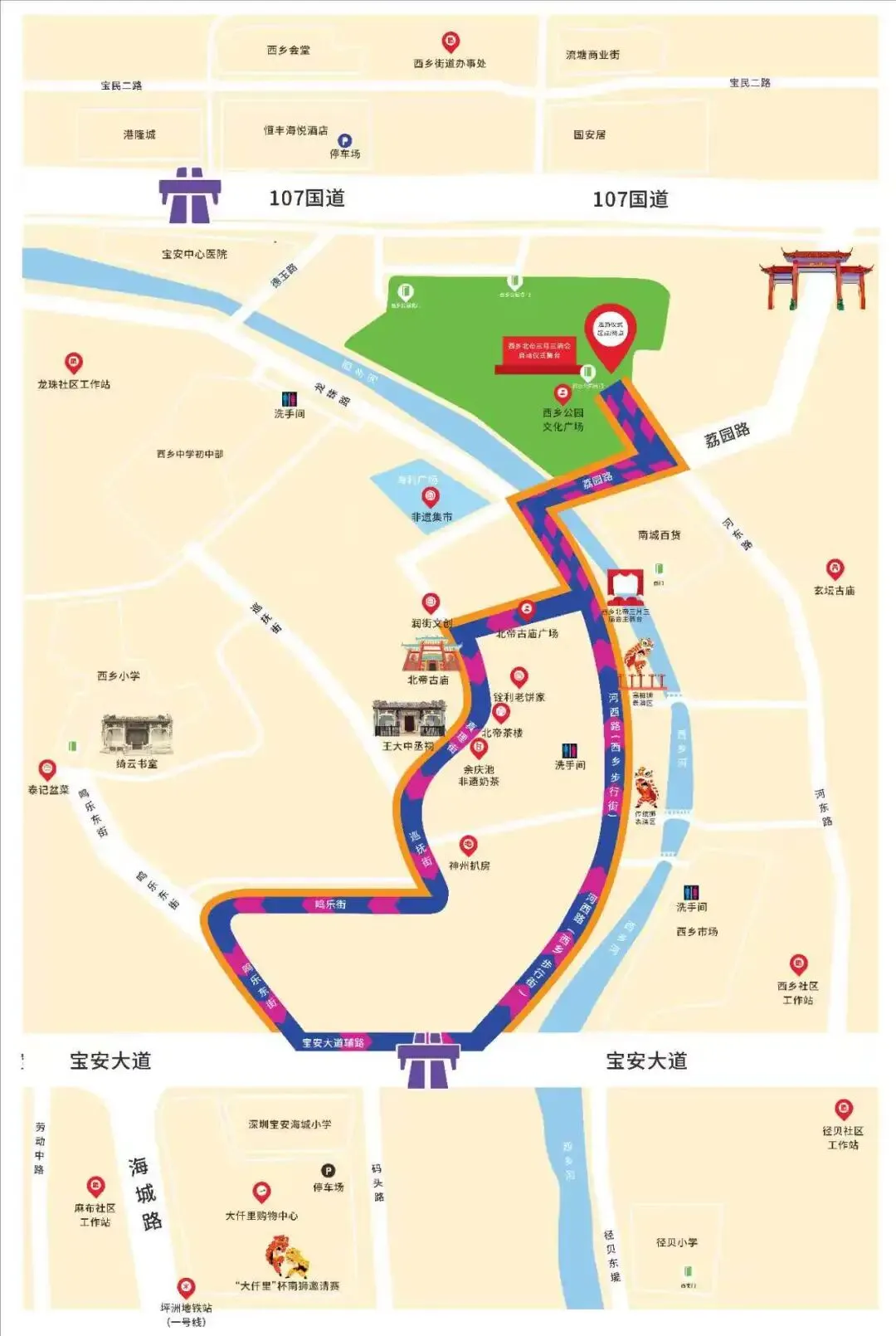 从西乡公园正门出发,途经南城桥、海利广场,沿线可打卡非物质文化遗产展、公益活动展,往前走便是热闹非凡的北帝古庙广场,锣鼓声、欢笑声此起彼伏,氛围感直接拉满。