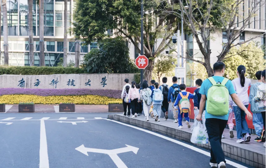 我们邀请南科大优秀学长学姐全程带队,带着孩子们解锁「九山一水」的绝美校园,走进教学楼、实验室,给孩子们讲自己的求学故事,分享名校的学习生活,让「考名校」不再是一句空洞的口号,而是在孩子心里生根发芽的梦想。