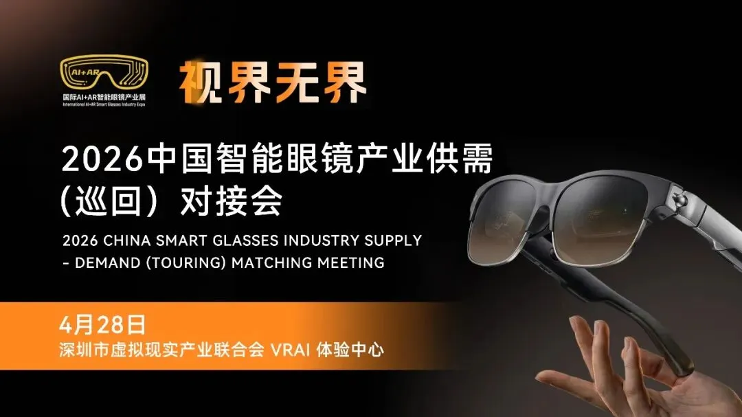 将于4月28日在深圳市虚拟现实产业联合会 VRAI 体验中心举办的视界无界・2026 中国智能眼镜产业供需(巡回)对接会,将紧扣智能眼镜与产业链发展痛点,打造一场 “高效对接、直面商机、落地合作” 的专业产业盛会。