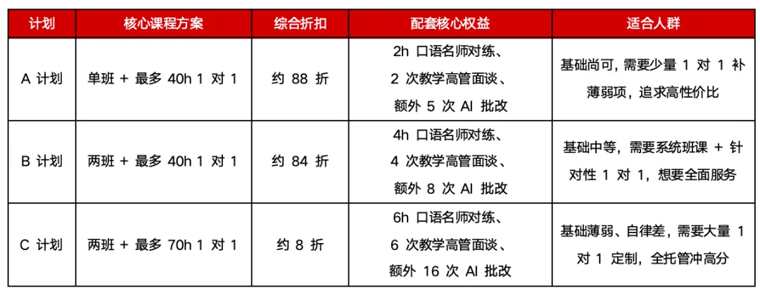 根据学员基础、目标分与学习强度,设置 A/B/C 三大方案,课程组合灵活,折扣力度逐级升级: