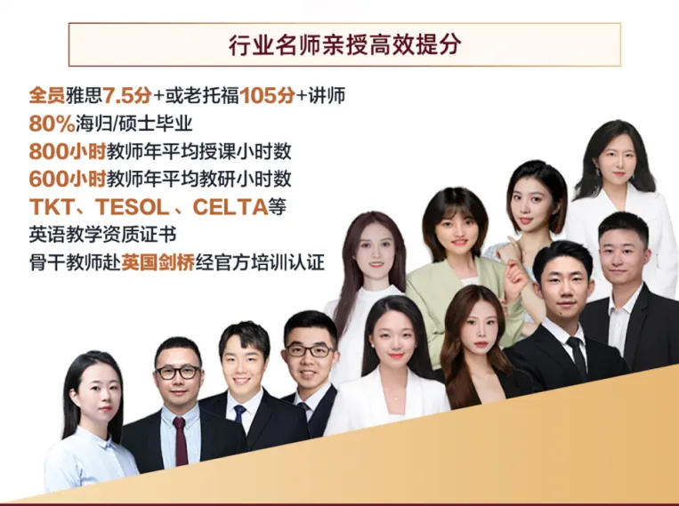 授课教师雅思均分7.5+、老托福 105+,80% 以上为海归硕士学历;