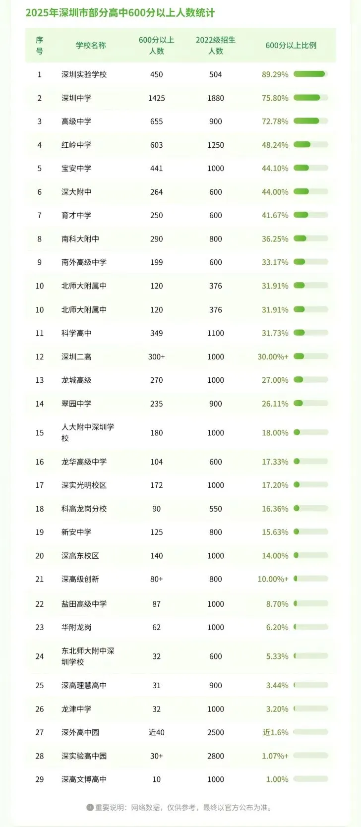 北师大南山附中、深圳科学高中、南外高中、深圳二高,其它高中600分率有较大浮动,主要是与高一录取线浮动排名有较大关系。