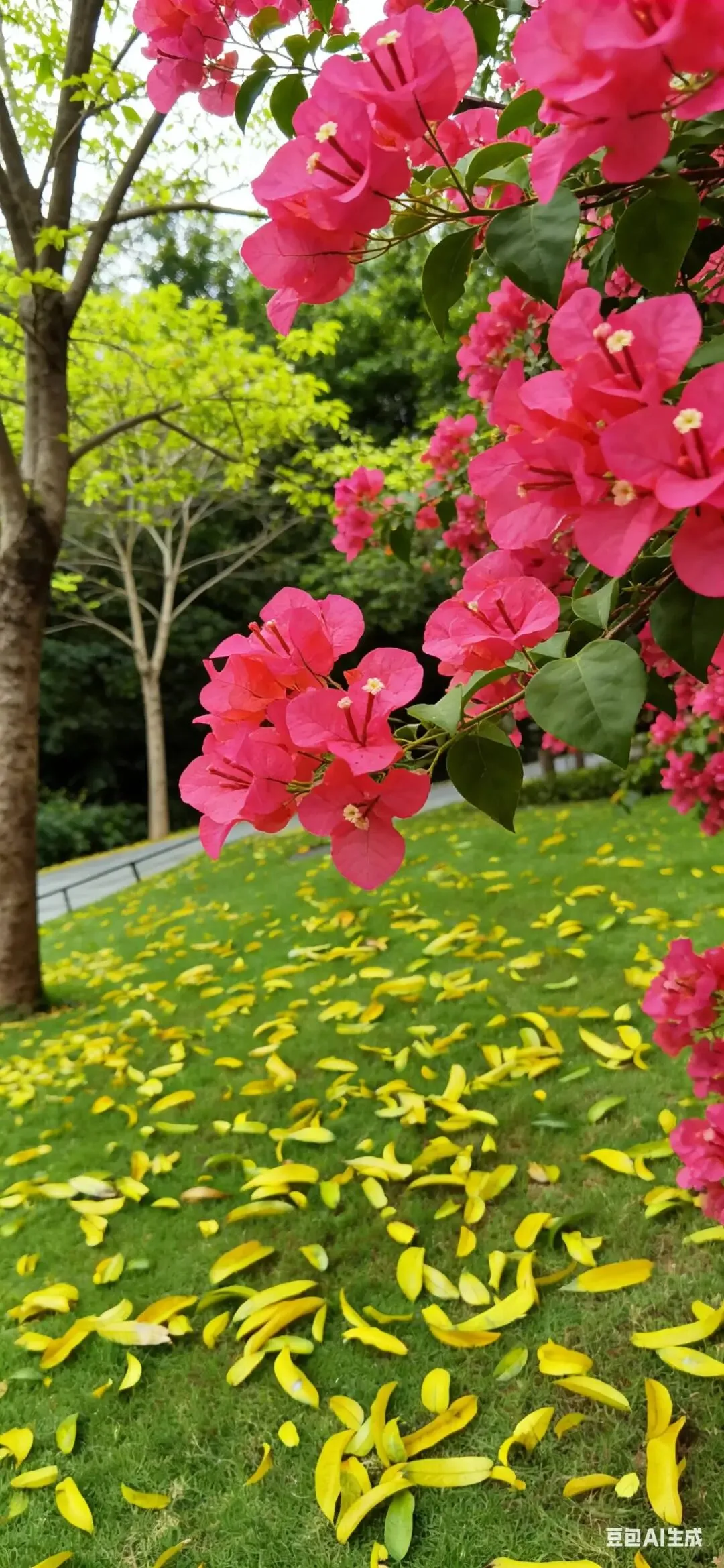 风一吹,黄叶悠悠飘落,像一场金色的雨,落在肩头,落在脚下;抬眼时,繁花灼灼盛开,带着岭南独有的热烈与鲜活。这是深圳春天独有的浪漫——没有单一的色彩,没有刻板的节奏,落叶是过往的沉淀,繁花是新生的期许,旧与新、落与开,在这里和谐共生。