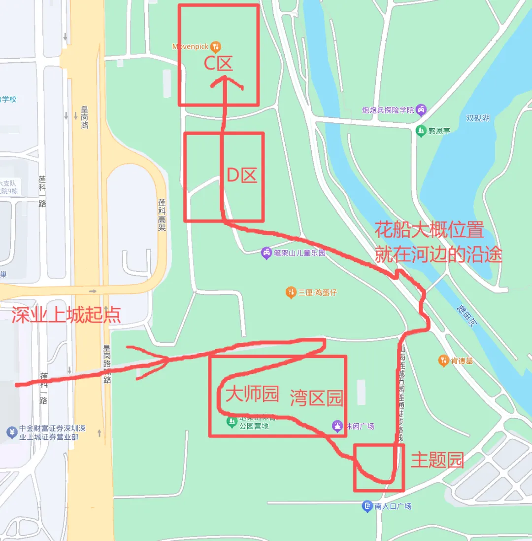 路线:冬瓜岭地铁E出口,然后走深业上城!走深业上城L3小镇东广场高价→笔架山幸福廊桥→笔架山体育公园。