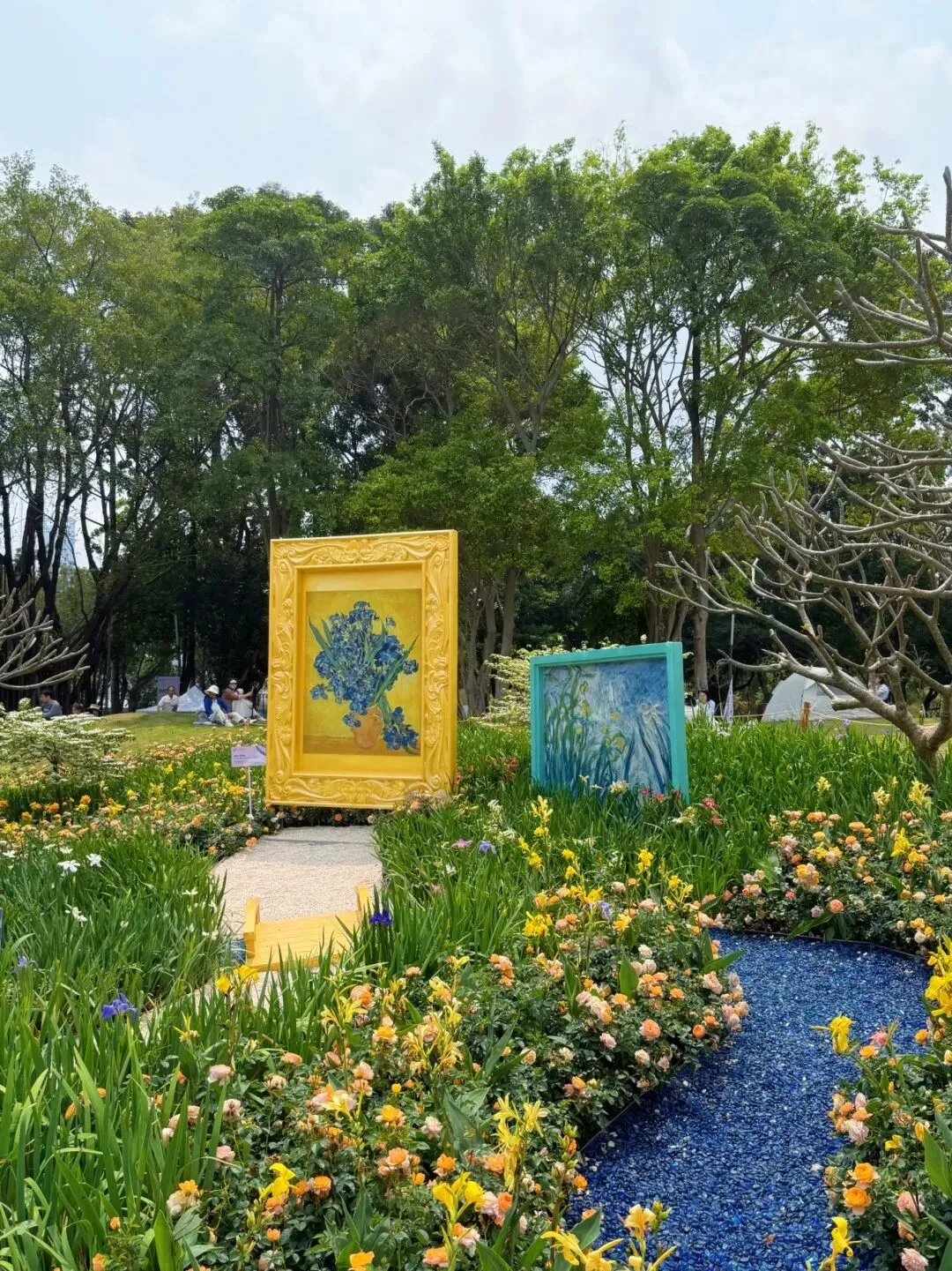 (3)然后前往K区主题花园,这里有较多的鸢尾花、以及2-5米高的大型油画、相框打卡点!还有靠近南门门口,有一条簕杜鹃长廊!(现场图片如下图所示)