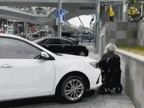 ▲汽车违停在人行道,残疾老人路过被卡。