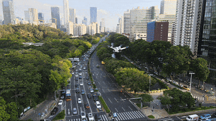 ▲1月28日起,早晚高峰时段,50台无人机集群在福田区核心路段升空。