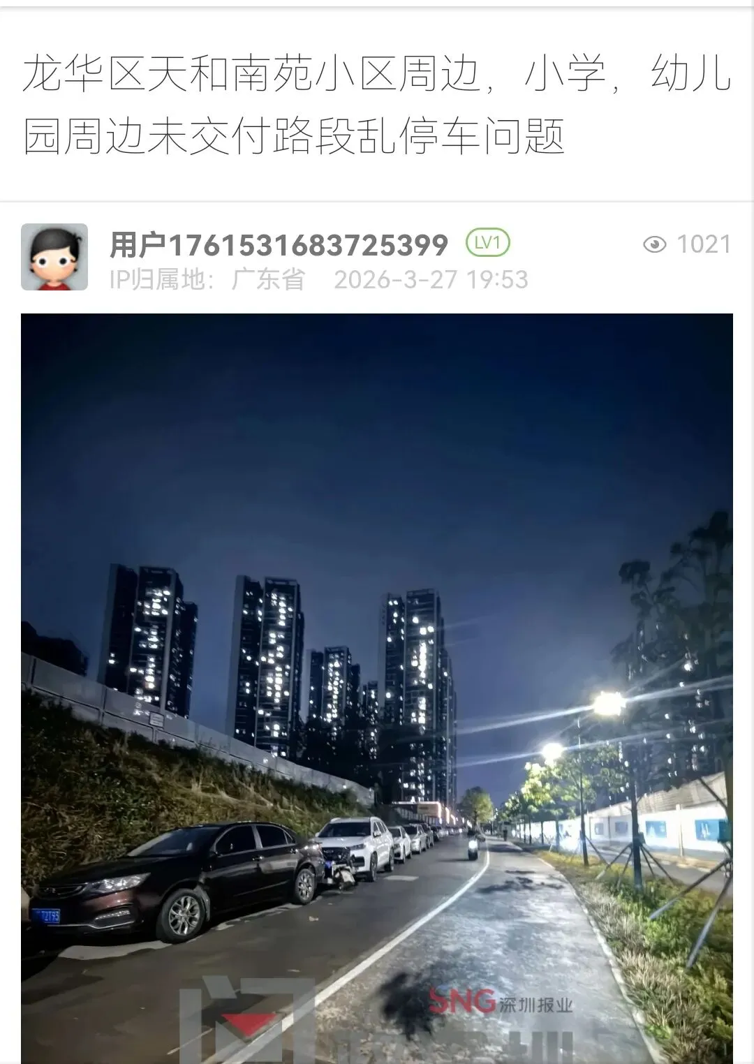 龙华区天和南苑小区周边,小学,幼儿园周边未交付路段乱停车问题