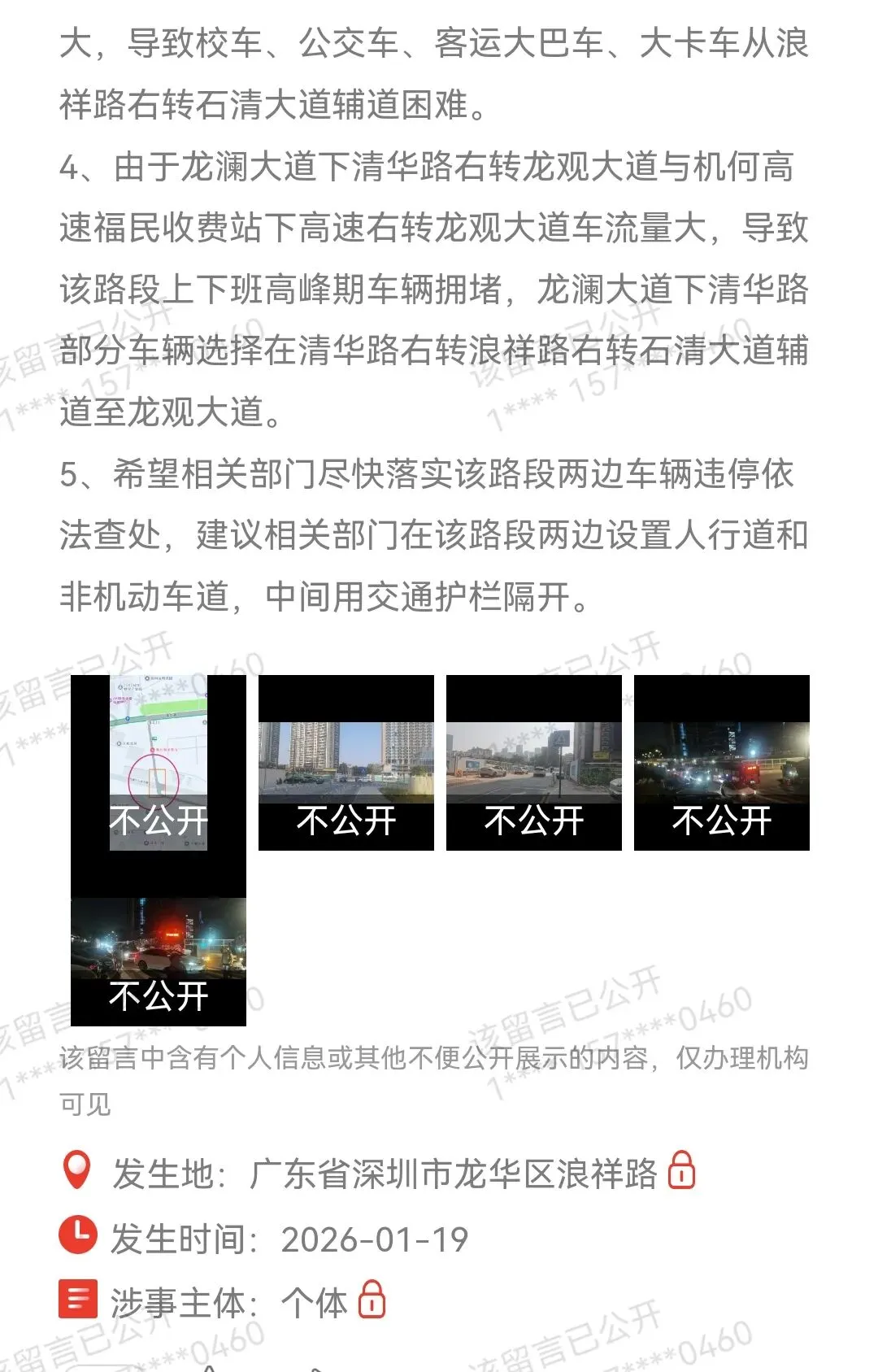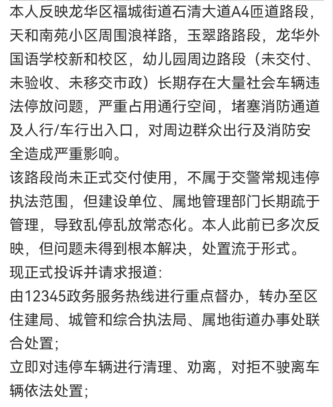 2026年3月27日,有网友反映龙华区福城街道石清大道A4匝道路段,天和南苑小区周围浪祥路,玉翠路路段,龙华外国语学校新和校区,幼儿园周边路段(未交付、未验收、未移交市政)长期存在大量社会车辆违法停放问题,严重占用通行空间,堵塞消防通道及人行/车行出入口,对周边群众出行及消防安全造成严重影响。