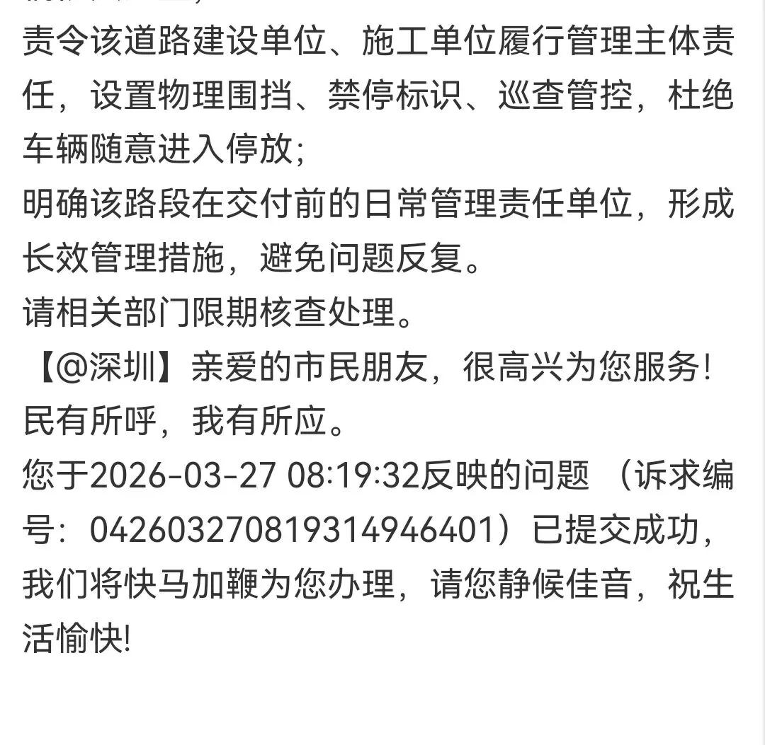 该路段尚未正式交付使用,不属于交警常规违停执法范围,但建设单位、属地管理部门长期疏于管理,导致乱停乱放常态化。本人此前已多次反映,但问题未得到根本解决,处置流于形式。