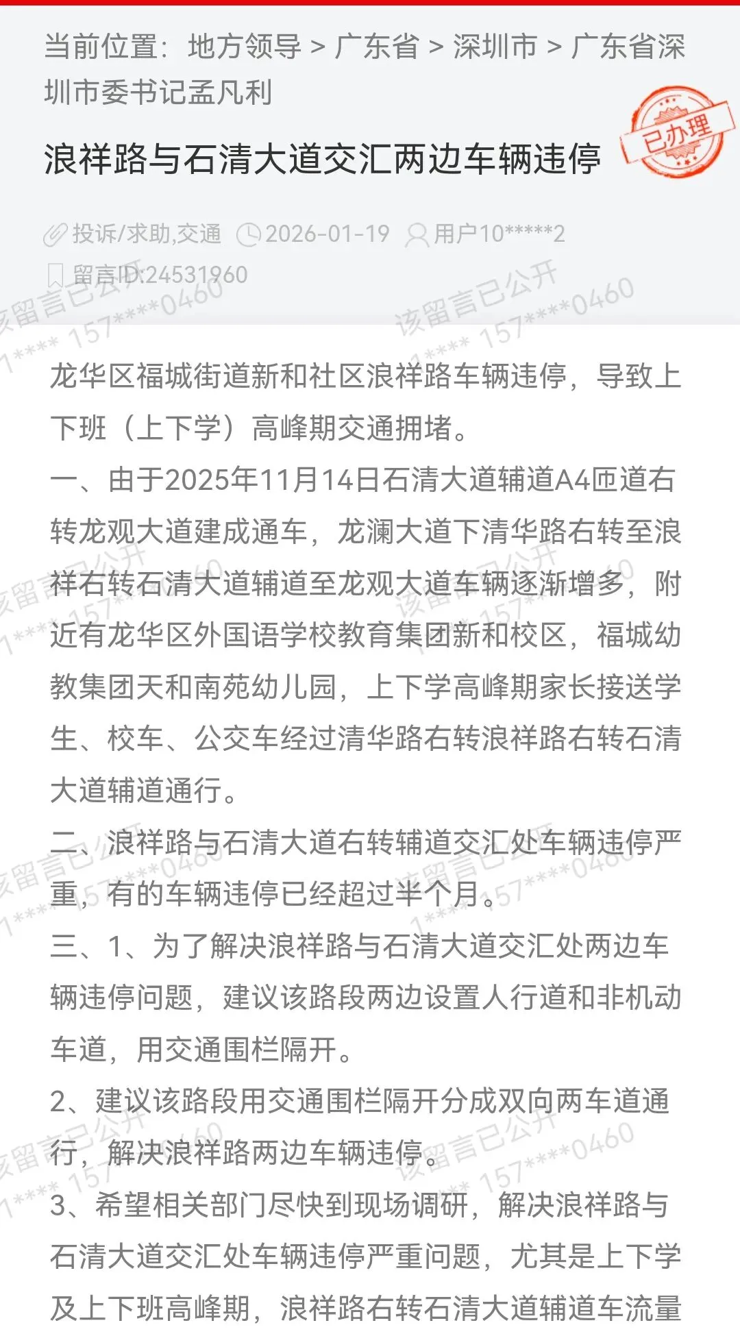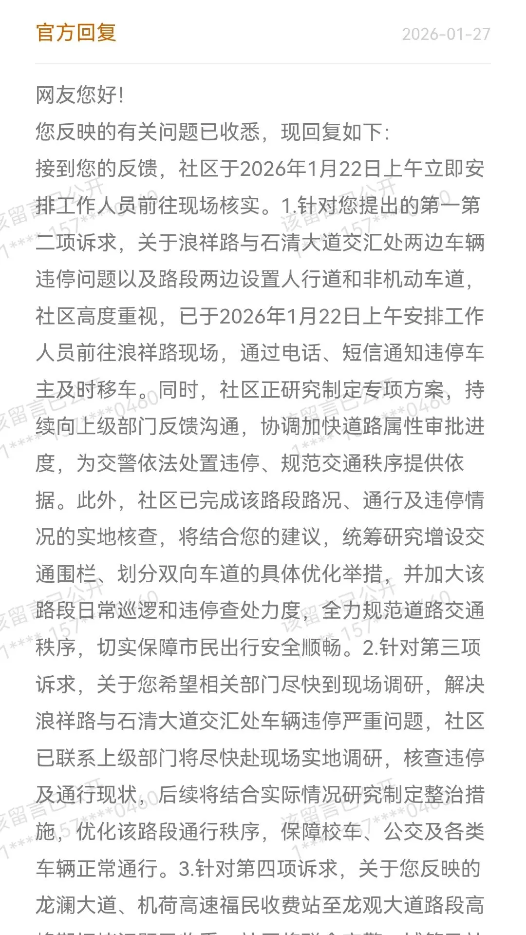您反映的有关问题已收悉,现回复如下:接到您的反馈,社区于2026年1月22日上午立即安排工作人员前往现场核实。1.针对您提出的第一第二项诉求,关于浪祥路与石清大道交汇处两边车辆违停问题以及路段两边设置人行道和非机动车道,社区高度重视,已于2026年1月22日上午安排工作人员前往浪祥路现场,通过电话、短信通知违停车主及时移车。同时,社区正研究制定专项方案,持续向上级部门反馈沟通,协调加快道路性审批进度,为交警依法处置违停、规范交通秩序提供依据。此外,社区已完成该路段路、通行及违停情况的实地核查,将结合您的建议,统筹研究增设交通围栏、划分双向车道的具体优化举措,并加大该留 路段日常巡逻和违停查处力度,全力规范道路交通秩序,切实保障市民出行安全顺畅。2.针对第三项诉求,关于您希望相关部门尽快到现场调研,解决浪祥路与石清大道交汇处车辆违停严重问题,社区已联系上级部门将尽快赴现场实地调研,核查违停及通行现状,后续将结合实际情况研究制定整治措施,优化该路段通行秩序,保障校车、公交及各类车辆正常通行。3.针对第四项诉求,关于您反映的龙澜大道、机荷高速福民费站至龙观大道路段高峰期拥堵问题已收悉,社区将联合交警、城管及社区网格力量,加大巡查频次,强化现场管控。4.针对第五项诉求,关于您反映的路段违停及增设人行道、非机动车道、交通护栏的建议已收悉,并反馈至上级部门将尽快赴现场核查调研,依法加强该路段违停查处力度,同时结合片区道路规划实际,研究论证人行道、非机动车道及交通护栏的增设可行性,后续将根据调研结果推进相关优化工作。后续,社区将建立该区域道路常态化巡查机制,定期排查违停及安全隐患,持续跟进整治成效,动态优亥留乳管控措施,全力保障辖区居民安全顺畅出行。关于您反映的问题,福城街道新和社区工作人员已把