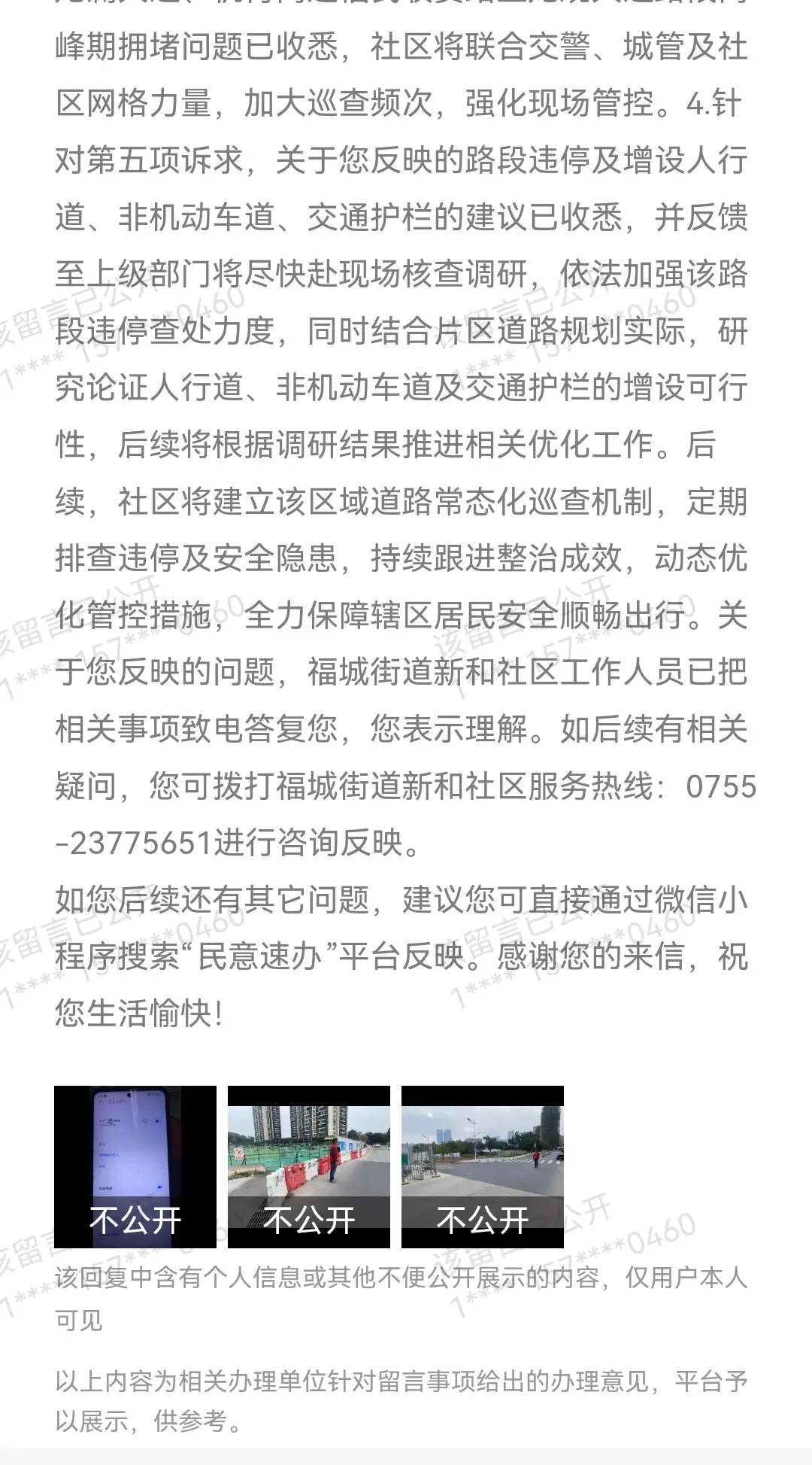 相关事项致电答复您,您表示理解。如后续有相关疑问,您可拨打福城街道新和社区服务热线:0755-23775651进行咨询反映。