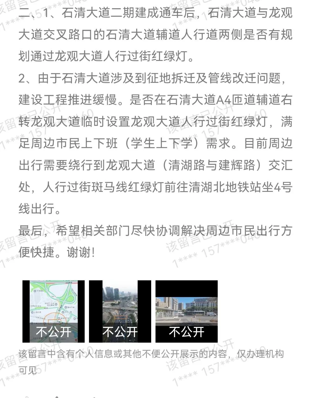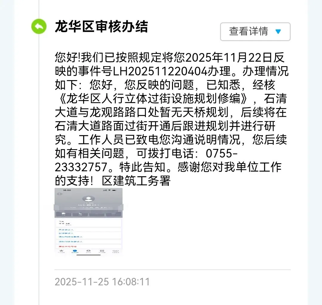 2026年1月30日下午,市区及所在地街道办现场调研查看后召开会议研究论证方法。根据《龙华区人行立体过街设施规划修编》,石清大道与龙观路路口处暂无天桥规划,该路口待石清大道建成通车后,将在石清大道与龙观大道交叉路口路面设置过街菱形立交设计有完善的慢行系统(含斑马线、信号灯)。