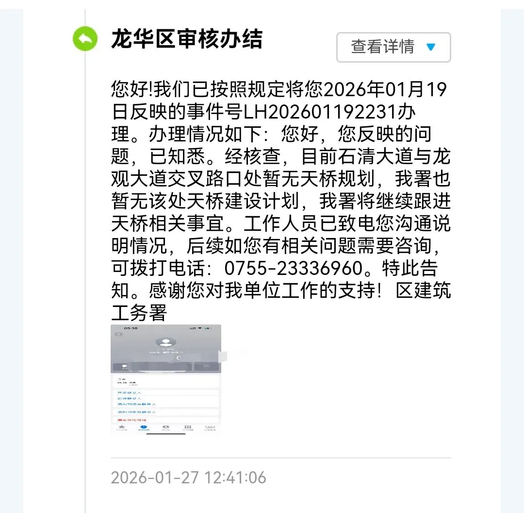 2026年1月27日,龙华区福城街道新和社区工作站回复: