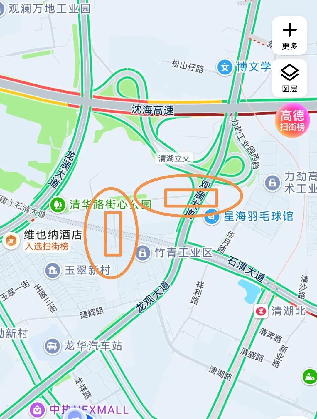 4、由于龙澜大道下清华路右转龙观大道与机何高速福民收费站下高速右转龙观大道车流量大,导致该路段上下班高峰期车辆拥堵,龙澜大道下清华路留部分车辆选择在清华路右转浪祥路右转石清大道辅道至龙观大道。