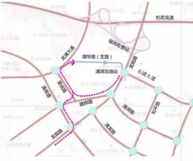 为了解决机何高速福民收费站下高速直行龙观大道车辆拥堵交通通行压力,根据相关规划,机何高速福民收费站由现在的观澜大道清湖立交迁移至龙澜大道新建收费站,新的福民收费站建成后,上下机何高速车辆从龙澜大道互通立交进出收费站。