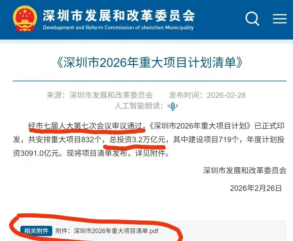 经市七届人大第七次会议审议通过,《深圳市2026年重大项目计划》已正式印发,共安排重大项目832个,总投资3.2万亿元,其中建设项目719个,年度计划投资3091.0亿元。现将项目清单发布,详见附件。