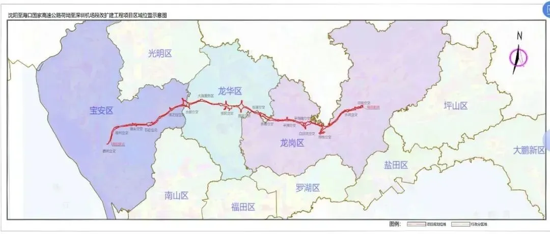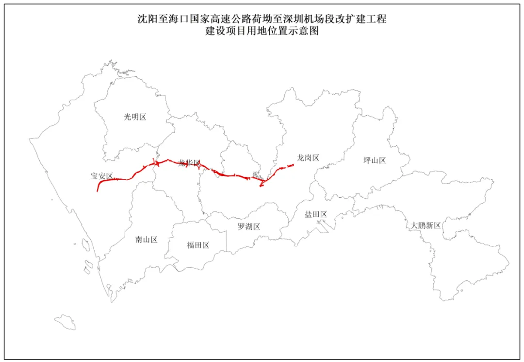沈阳至海口国家高速公路荷坳至深圳机场段改扩建工程(简称机荷高速公路),起点于龙岗区荷坳立交处,顺接惠盐高速;终点于宝安区鹤州立交,对接深中通道,途经宝安区、龙华区、龙岗区。