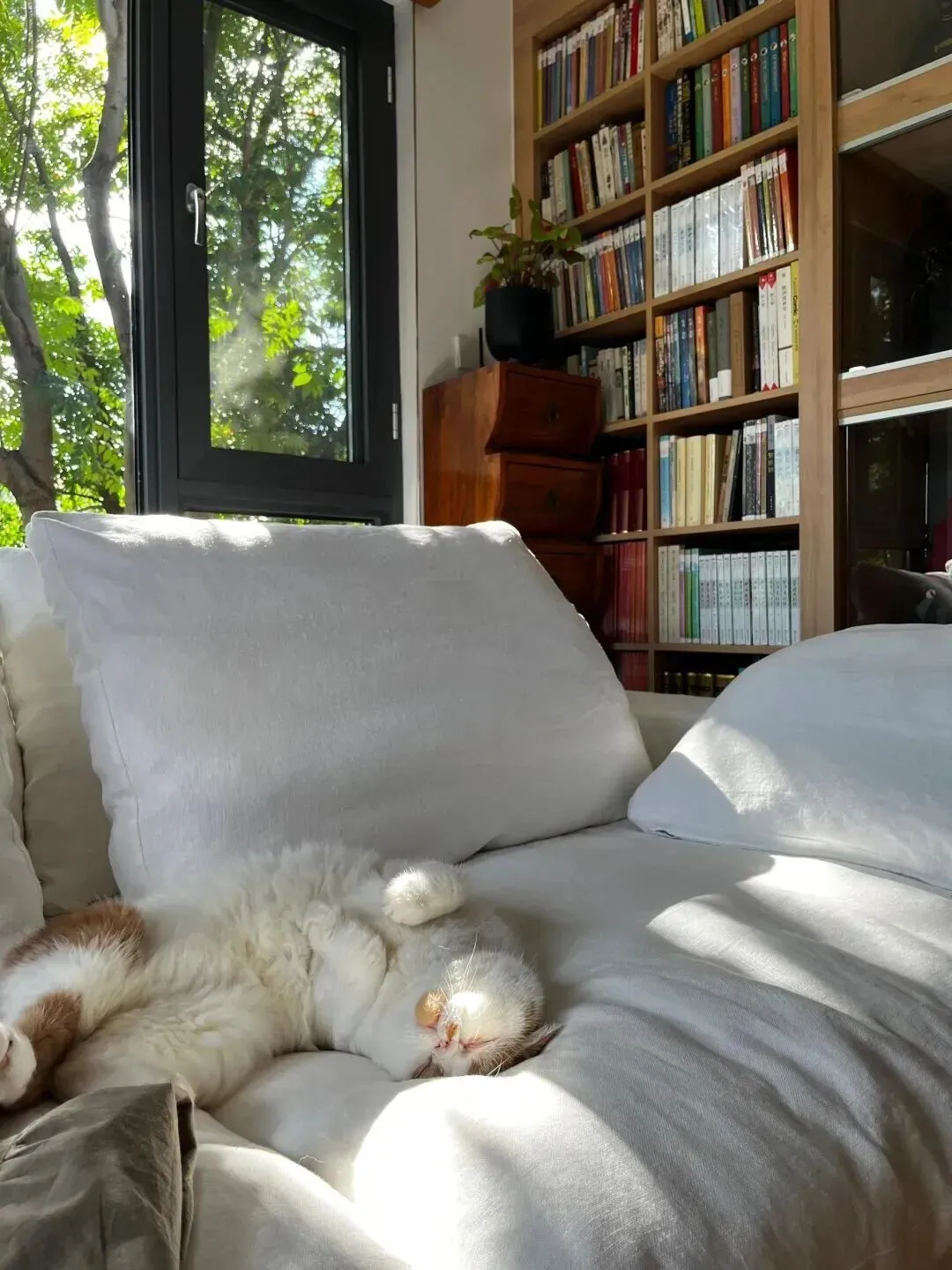 你说现在流行什么?极简风、性冷淡、样板间……可你真住进去就知道,冰冷的桌椅、没温度的摆设,住久了真能把人憋出病。像她家那张大沙发,白色的,软软的,随便往上一躺,连猫都能睡得四仰八叉——这才叫生活的烟火气。