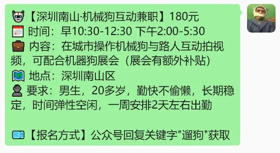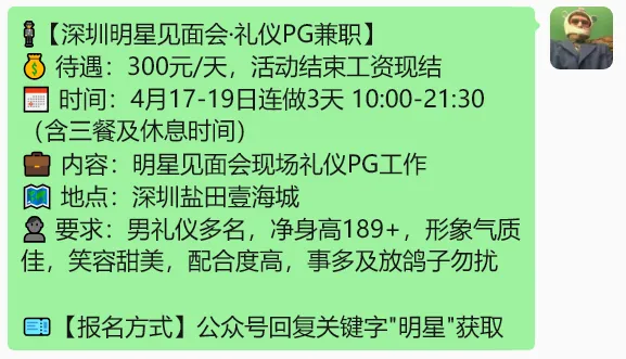【深圳兼职】180元/遛狗、200元/群演、300元/明星见面会、420元/金铲铲之战、300元/发型染烫、400元/礼仪接待......