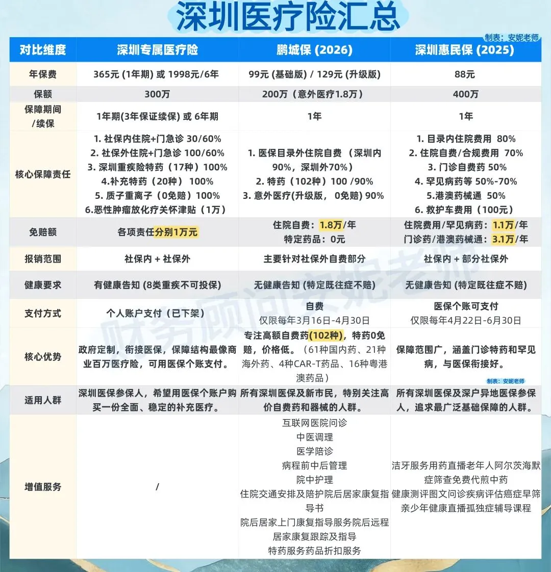 3. 身体健康(必选):商业医疗搭配 ——太平超e保 / 医安心在【社保】和【鹏城保】基础上,尽可能根据预算选择商业医疗险,不用通过买多个“惠民”产品去东拼西凑自己的医疗保障,一个产品几乎可以堵住各方面医疗费漏洞;商业百万医疗的免赔额更低、报销额度更高、报销报销比例更高。太平超e保(长享版) 10年保证续保是关键优势,保障400多万,锁定长期保障。保额高,能有效转移大病风险。希望连小病住院也能报销,实现“住院不花钱”,可以买医安心,0免赔,解决高频小额医疗支出。2.身体较好:(不介意免赔额)深圳医保 + 太平超医保 3.身体较好:(追求0元起赔)深圳医保 + 太平医安心请注意:以上信息基于2025-2026年的公开资料整理,具体保障责任、价格、投保规则请以购买时保险公司官方最新条款为准。购买前请务必仔细阅读产品条款,特别是健康告知、免责条款、理赔条件等关键内容。健康告知是购买商业保险的关键环节,请务必如实告知,这直接影响后续理赔。